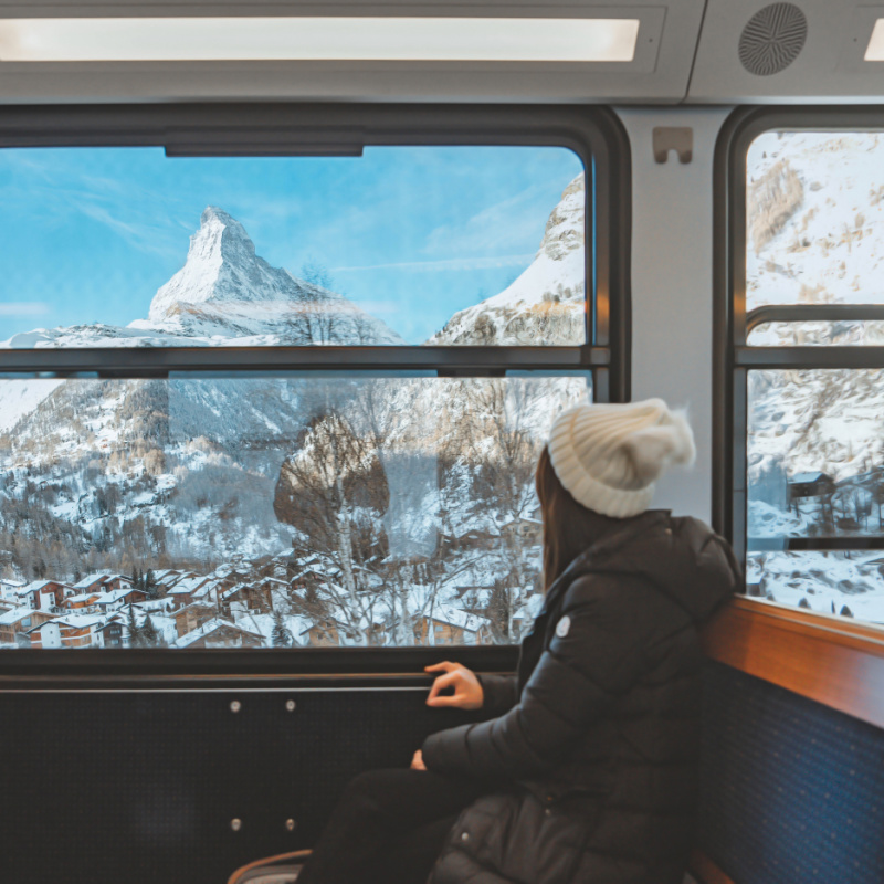You can’t beat the views from the Ski Express’s panoramic windows as you look out over snow-covered mountains.