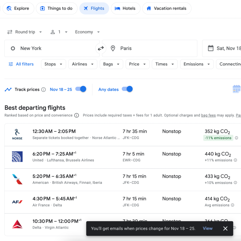Finally, Google Flights gives you the option to set fare alerts and track prices for a specific search.