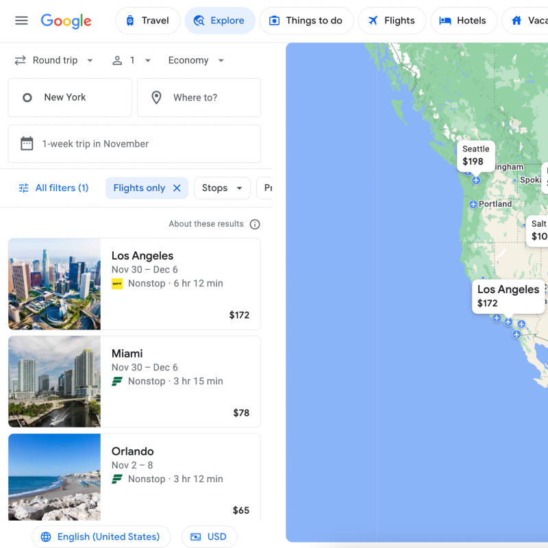 Google Flights will then show you a map with all the destinations you can fly to and the cost for the dates you have selected. This is a great way to browse and look for a cheap destination without having to make multiple searches for different destinations.